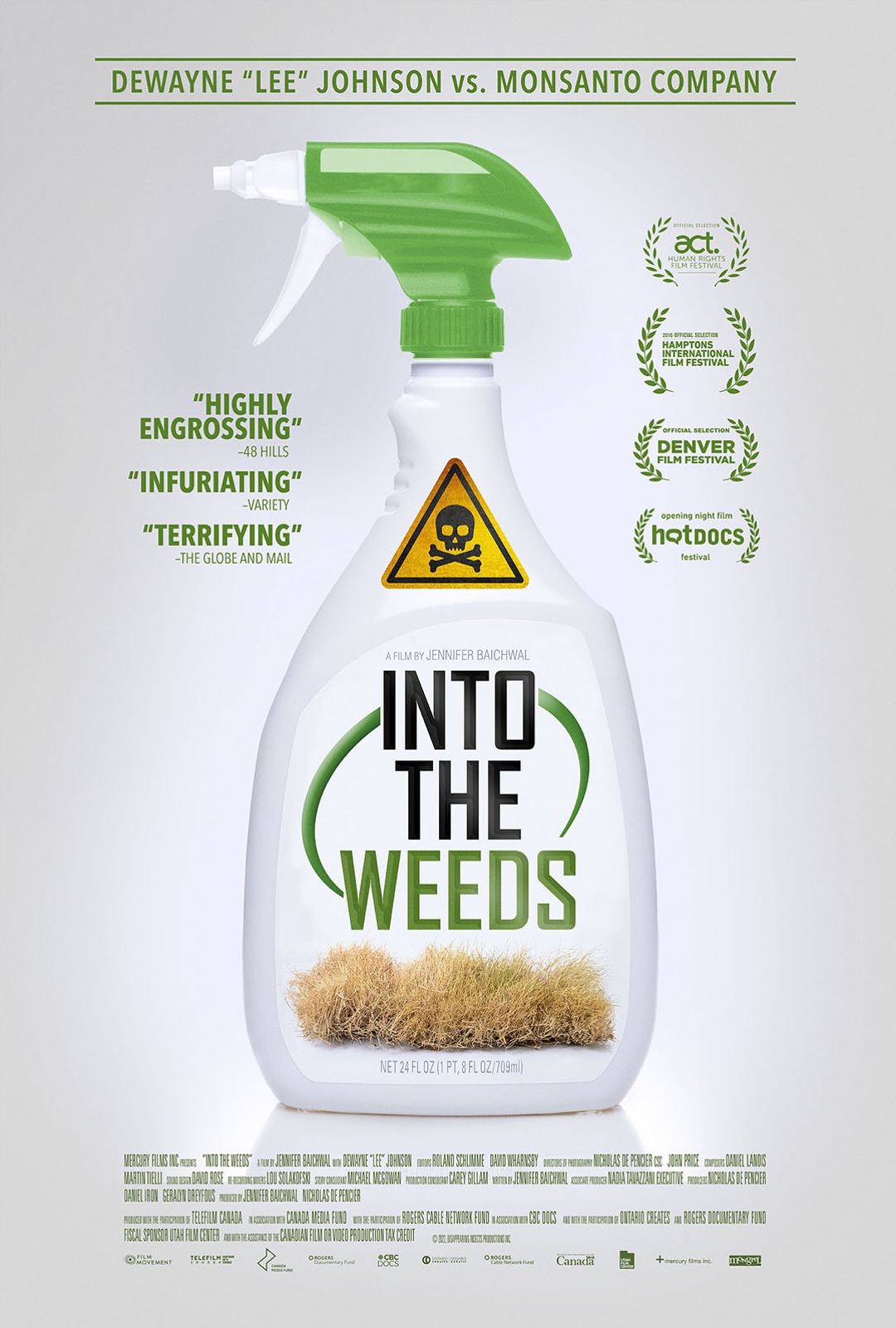 In 2015, the International Agency for Research on Cancer (IARC), a branch of the World Health Organization, classified glyphosate - the active ingredient in Roundup - as “probably carcinogenic to humans.” A year later, Lee Johnson filed a lawsuit claiming that Ranger Pro, a commercial-grade variant of Roundup, was a substantial contributing factor in causing his Non-Hodgkin’s lymphoma. Johnson’s was the first ‘bellwether’ case in a mass tort against Monsanto involving tens of thousands of plaintiffs. Blending interviews, trial footage, news coverage and vérité, the film follows the progression of this groundbreaking trial, while also telescoping out to understand both ubiquity of use and its global repercussions.
